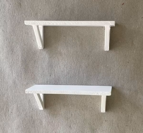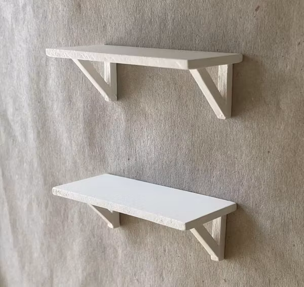 Två hyllor i trä. De är målade vitaLängd ca 70 mm, djup ca 30 mm