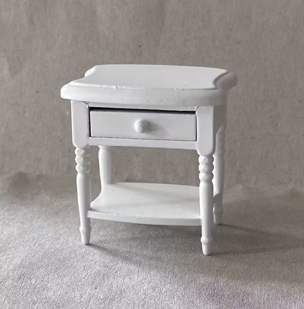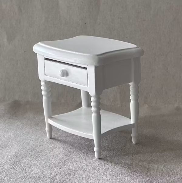 Vitmålat sängbord i trä. Den har öppningsbar låda och en hylla under.Höjd ca 50 mm, ca 45 x 50 mm