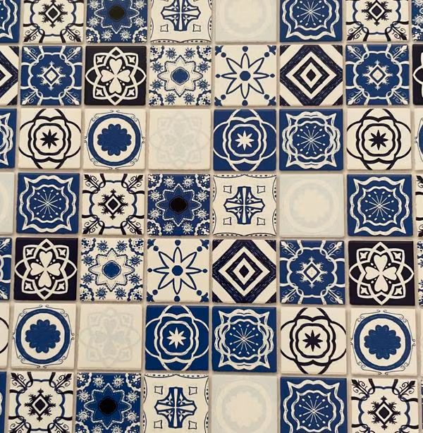 Kakel i blått och vitt. Arket är präglat och blankt.