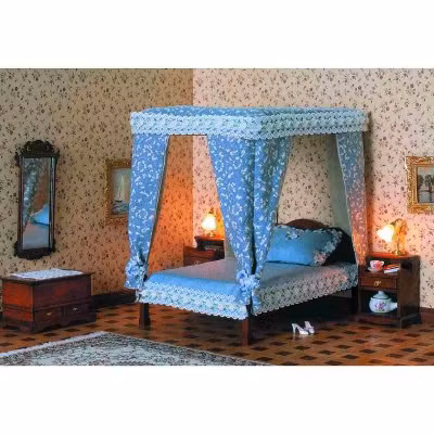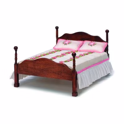 Säng i byggsats. Omålat trä, skala 1:12 Den kan byggas både som vanlig säng och som stolpsäng med förhängen. Se bilderna Chippendale double bed w