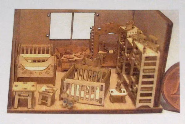 Lasersågat Byggsats möbler och tillbehör till ett helt barnrum skala 1:144