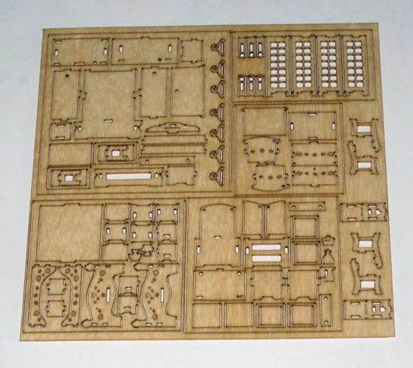 LasersågatByggsats möbler och tillbehör till sovrum skala 1:144 Sista bilden visar en byggd och målad dubbelsäng