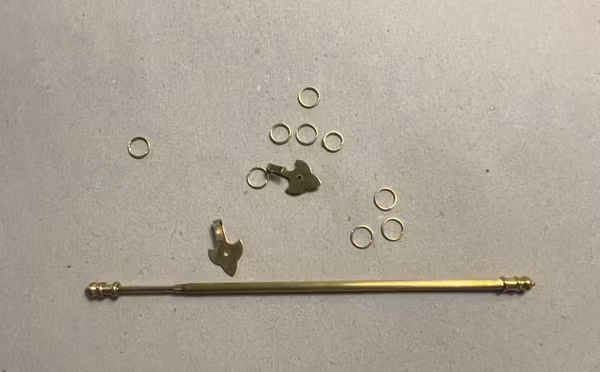 Gardinstång i mässingsfärg. Den har fästen och ringar. Kortaste längd ca 120 mm, utdragen max ca 195 mm.