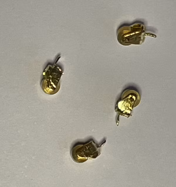 Fyra stucken små möbelhjul i mässing. Hjulen går att snurra på. Höjd ca 4 mm + piggen.