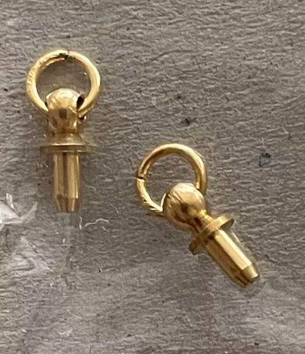 Två ringhandtag i mässingsförg. Ca 4 mm långa + ring och fäste.