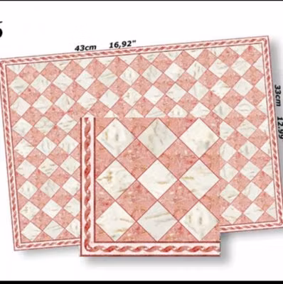 Tryckt på kraftigt papper, har blank yta. ca 330 x 430mm rosa/vitt med inslag av grå-beige Golv till dockskåp eller tittskåp