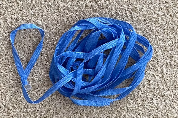 ljusblått band. Längd ca 1 meter, bredd ca 2 mm