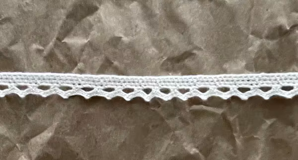 Ljusbeige spets. Ca 90 mm lång och 10 mm bred