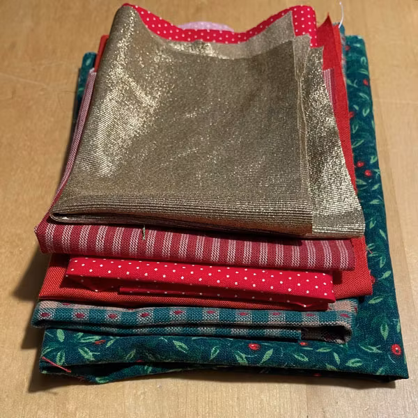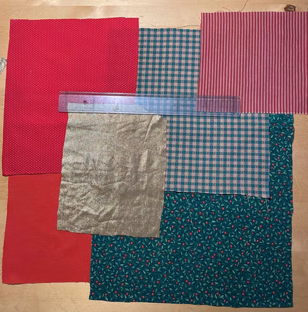 Tyger med jultema. Alla är i bomull utom det guldiga. Linjalen är ca 30 cm lång. Bitarna är lite olika stora.