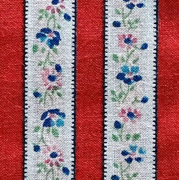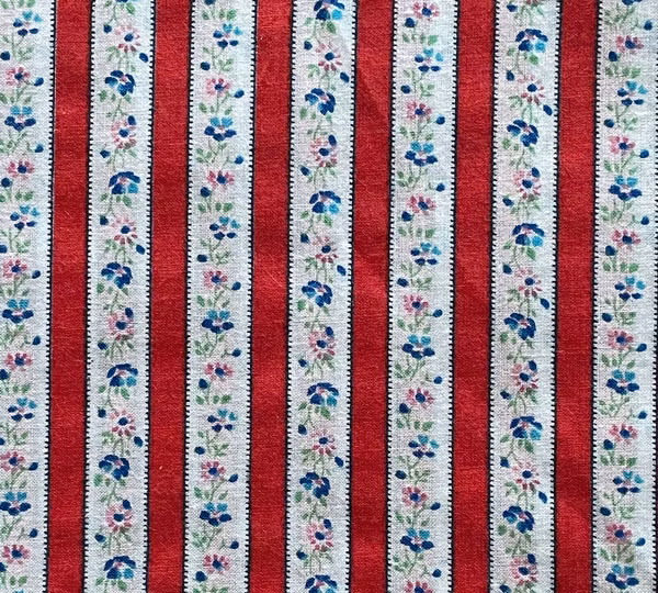 Tryckt bomullstygDen röda randen är ca 7 mm bred. Tygbiten är ca 38 x 28 cm stor. Bilden visar en del av tygbiten.