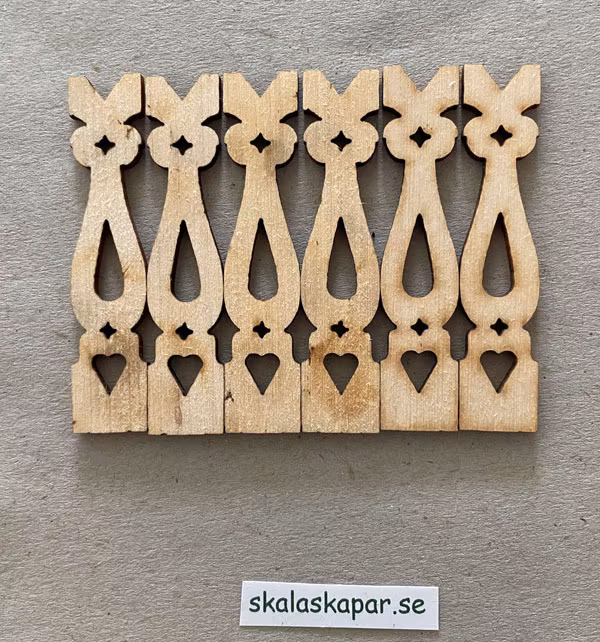 6 bitar snickarglädje. Laserskuret i lind. Höjd ca 59 mm, Bredd ca 12 mm, tjocklek ca 2 mm. Använd som verandastaket, sätt som dekoration på ett lusth