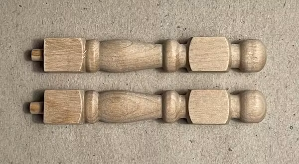 2 st stolpar / svarvade pinnar i träLängd ca 70 mm + tapp Bredd på bredaste stället ca 11 mm