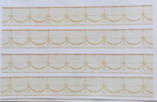 Tapetbård, gula rosetter. 4 st på ett ark. H ca 33 mm, L ca 270 mm Bården är från början handmålad, nu utskriven på 80g papper med laserskrivare.