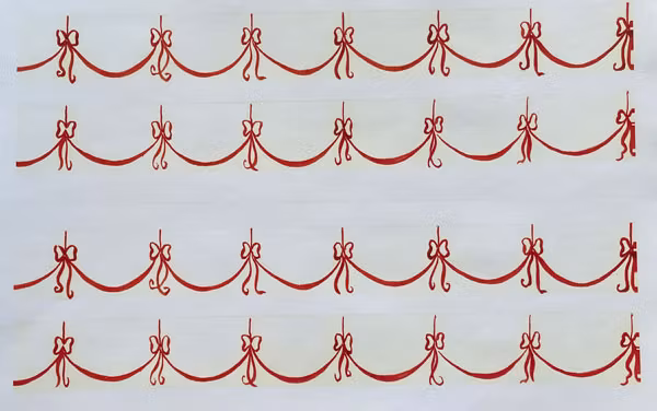 Tapetbård, röda rosetter. 4 st på ett ark. 2 olika bårderH ca 30 mm, L ca 270 mm Bården är från början handmålad, nu utskriven på 80g papper med laserskriv