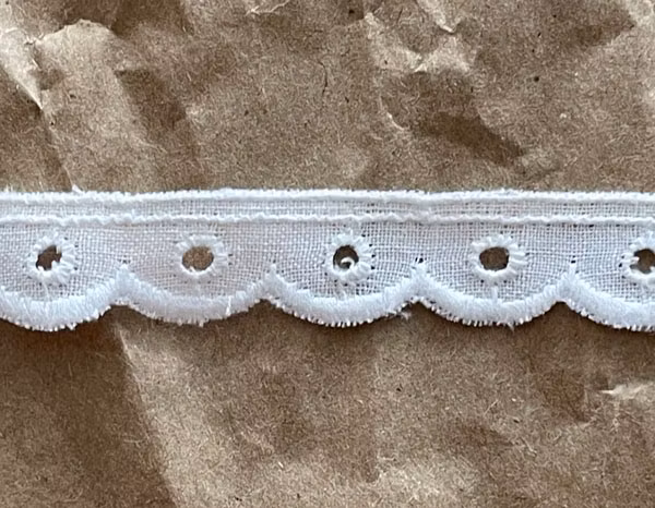 Vit brodyr i bomull. Ca 1 meter lång. ca 12 mm bred