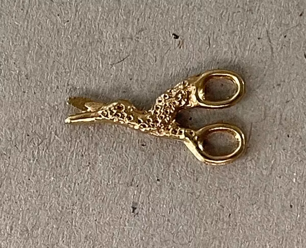 Liten utsirad sax i metall till dockskåpet eller tittskåpet. Längd ca 24 mm Sax i metall, ej öppningsbar