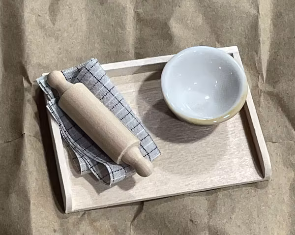 Bakbord tillverkat i lindträ. Skål i porslin med brun utsida. Brödkavel i trä. En liten bakhandduk att lägga över degen när den jäser.