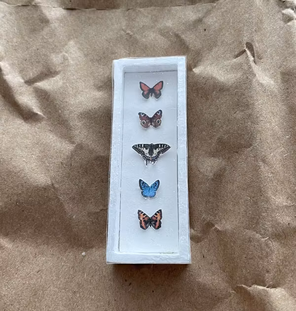 Fjärilstavla med fem fjärilar i papper. Lådan är i trä och målad vit, plastglas framför tavlan.Yttermått ca 53 x 19 x 6 mm