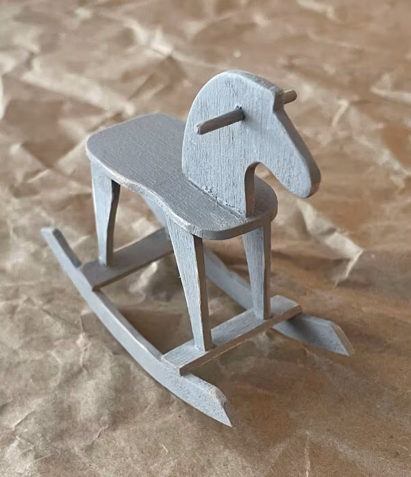 Handgjord gunghäst, tillverkad från lösvirke, lind.Den är målad grå och lite "sliten". Gunghästen är signerad och namnet Brunte står på undersidanSitthöjd