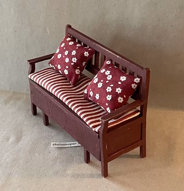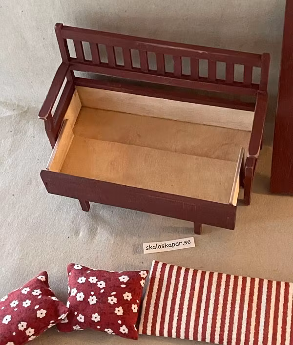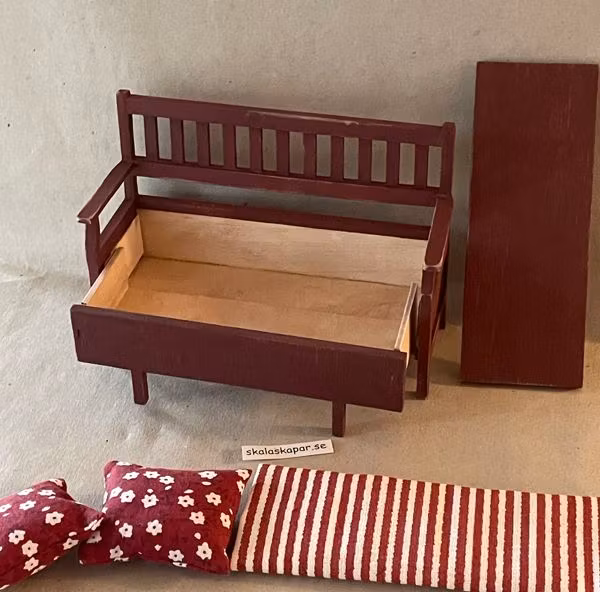 Kökssoffa byggd från en byggsats i trä, plywood. Soffan går att öppna och dra ut. Dyna och två kuddar följer med.Den är rödmålad, lite slitenca 125 mm stör