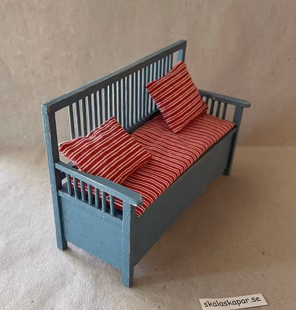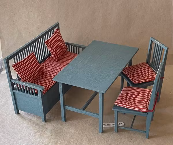 Set med kökssoffa, två stolar och ett bord i skala 1:12. Möblerna är byggda i lindträ från "lösvirke". De är målade i en gråblå färg. De är gjorda lite slitna. Dynor och kuddar är sydda av handtryckt tyg, silkscreenteknik.