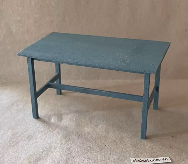 Set med kökssoffa, två stolar och ett bord i skala 1:12. Möblerna är byggda i lindträ från "lösvirke". De är målade i en gråblå färg. De är gjorda lite slitna.