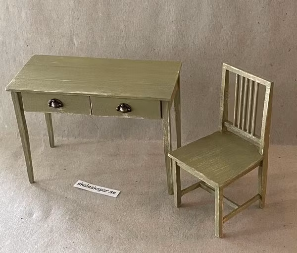 Skrivbord och stol i trä, målad först vit sedan ljusgrön. Lite slitna och smutsiga. Skrivbordet är byggt av furulister. Lådorna går att dra ut och lägga sa