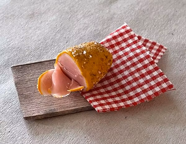 Julskinka på träskärbräda. Med handduk. Allt ligger löst så du kan lägga den på ett fat eller nå't. Brädan i trä är ca 30 x 43 mm. Skinkan är ca 15 mm hög.