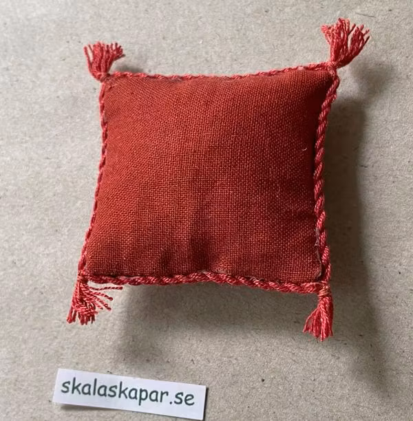 Tryckt kudde kantad med snodd och med tofsar i hörnen. Enfärgad röd baksida
