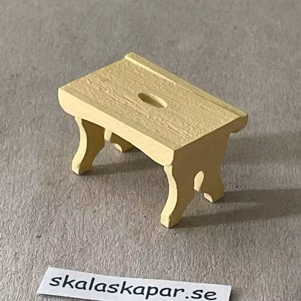 En liten gulmålad pall i trä, lind. Den är ca 30 x 18 mm, Höjd ca 18 mm Signerad, originalpallen i skala 1:1 finns hemma hos Lokrantz, Malmköping