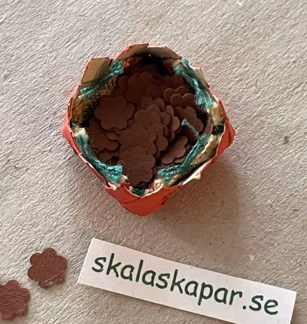 Pepparkakor i papper som ligger på en duk i en korg flätad av papper.Korgen är ca 23 x 23 mm