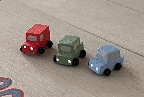 Tre bilar tillverkade i trä, lind. Längd ca 10 mm.