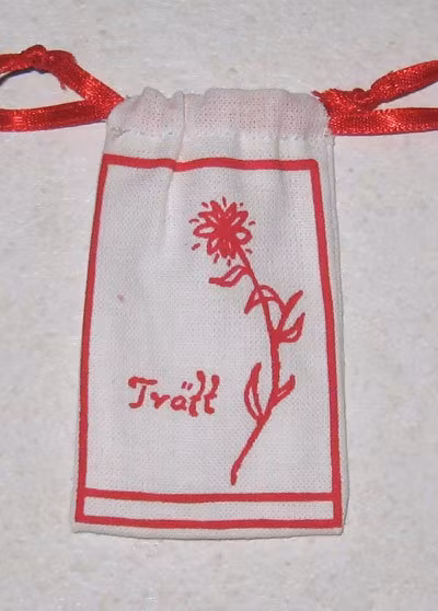 Tvättpåse. Tryck med silksceentryck på bomullstyg. Ca 40 x 60 mm