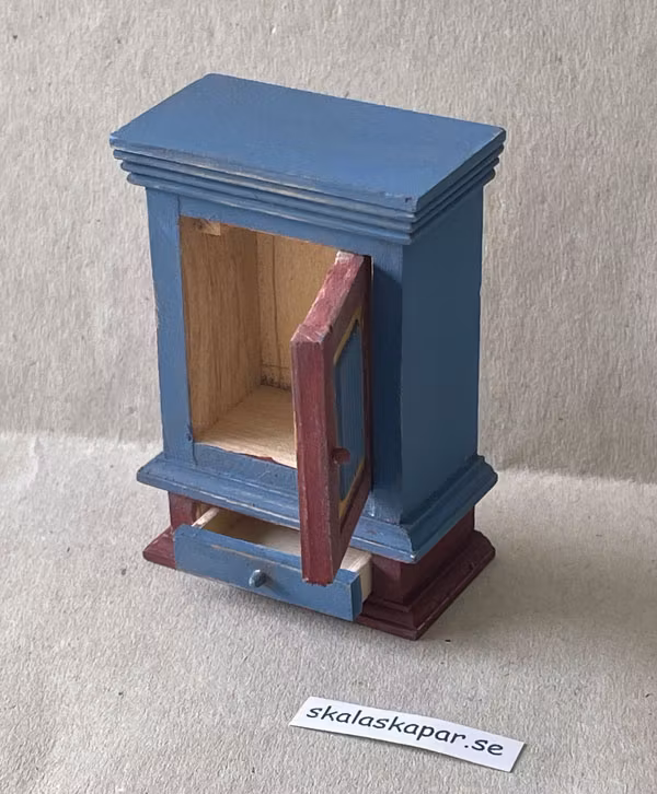 Handmålat väggskåp i trä. Både lådan och dörren är öppningsbara. Målad blått och rödbrunt med lite gult inslag. Lite "sliten" H ca 70 mm, B ca 49 mm, D ca