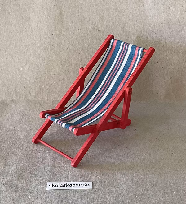 Hopfällbar solstol, rödmålad med handtryckt tyg Längd när den är ihopfälld ca 110 mm