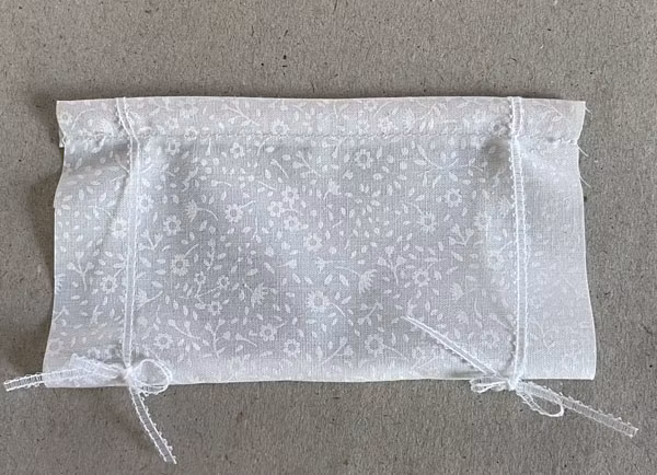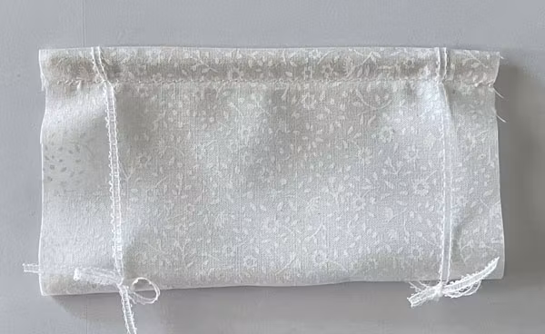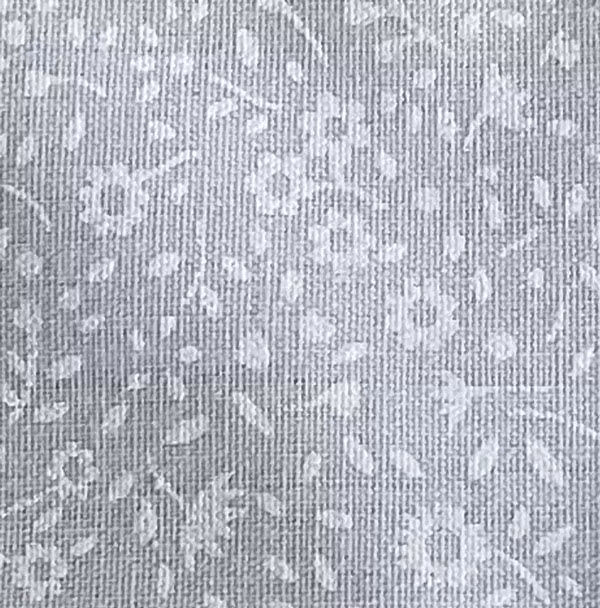 Hissgardin. Vitt bomullstyg med tryckta vita blommor. Gardinstång och rulle i trä.