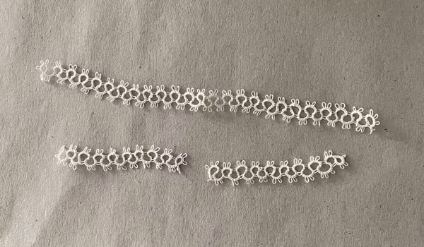 Handgjord spets att sy på lakan och kudde till dockskåpssängen Frivolitetsarbete, det ligger många timmars arbete bakom dem. en som är ca 14 cm lång o
