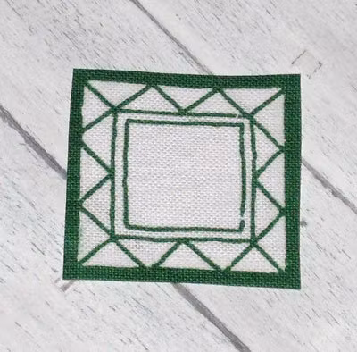 Grön duk tryckt med silkscreenteknik på bomullsväv handtryckt. Trycket kan variera ca 35 x 35 mm
