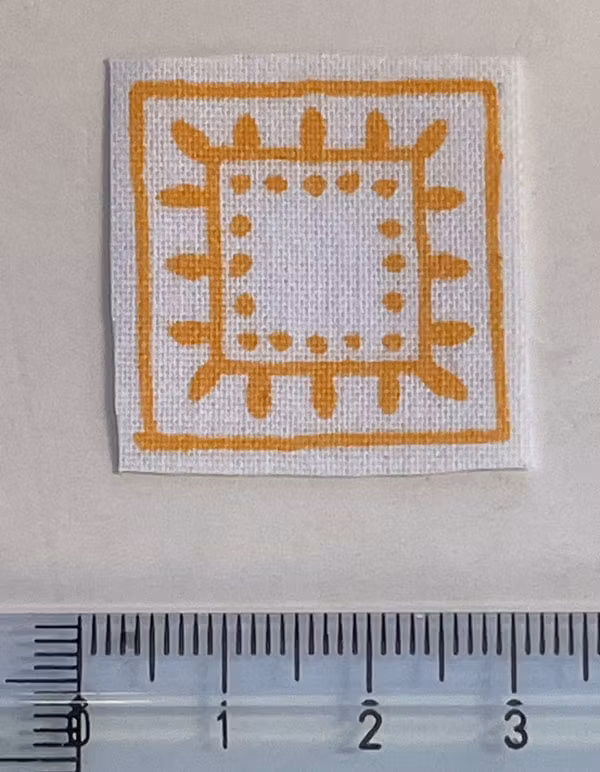 Gul duk tryckt med silkscreenteknik på bomullsväv handtryckt. Trycket kan variera ca 30 x 30 mm